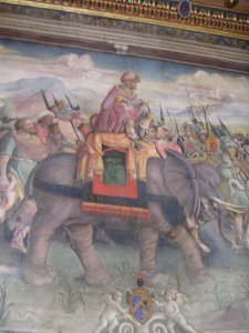 Toen mijn maag weer gevuld was, werd het tijd om ook mijn oog de kost te geven. De eerste gelegenheid die zich voordeed was de Engelenburcht, in goed Italiaans Castello Sant' Angelo. Dit was (alweer) een mausoleum in de oudheid, zij het dat hier Hadrianus en kornuiten hun - min of meer - laatste rustplaats vonden. Hun as is nu overigens niet meer aanwezig. Daarna is het langzaam uitgebreid tot een aanzienlijke vesting waar de paus in geval van nood naartoe kon vluchten. Dit is dan ook een plaats waar je kanonnen, harnassen en geheime gangen kunt vinden - al zijn die laatste niet vrij toegankelijk. De paus moest natuurlijk wel in stijl kunnen leven, dus aan sjiek gedecoreerde vertrekken en een enorme schatkist (die ooit ook gevuld moet zijn geweest) ontbrak het hier ook niet. De engel die er bovenop staat is alweer de vijfde; zijn voorganger staat op de binnenplaats in de burcht. Overigens vind ik dat de huidige, gemaakt door een Belg, mooier is dan die op de binnenplaats. Vanaf de Engelenburcht heb je ook een alleraardigst uitzicht.
