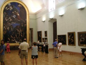 Aan dit plein liggen drie kerken, waarvan 2 vrijwel elkaars spiegelbeeld lijken. Helaas heb ik daar geen mooie foto van kunnen nemen in verband met tegenlicht. De derde kerk, de Santa Maria del Popolo, heb ik even van binnen bewonderd. Daar hangen onder meer 2 werken van de beroemde schilder Caravaggio: Petrus die gekruisigd wordt (ondersteboven, want op dezelfde manier sterven als Jezus Christus vond hij teveel eer), en Paulus die bekeerd wordt (hij viel er spontaan van van zijn paard).