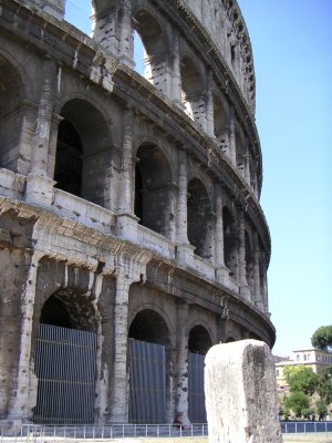 Zondag het colosseum bezocht, en weer bleek dat mijn bezoek aan het Palatijn een goede keus was: in plaats van 15 minuten te wachten in de rij (net zoals in de efteling stond de wachttijd met een bordje aangegeven), mocht ik meteen doorlopen en naar binnen. Er was een interessante expositie over de gevolgen van de stedenbouw voor de archeologische plaatsen door de eeuwen heen, en er draaiden compilaties van filmbeelden waarin het colosseum voorkwam. Die waren echt heel leuk om te zien, vooral de beelden van een zwart-wit film waarin een monster tevoorschijn kwam uit de trappen van het Capitool, en het Colosseum beklom, zo'n beetje de Italiaanse Godzilla. En natuurlijk stop-motion geanimeerd! Er waren ook beelden van 11 september doorheen gemonteerd. De link met het Colosseum kon ik echter niet leggen. Er werd je ook een blik op de toekomst gegund: dan worden er een soort eivormige uitkijkposten aangelegd die je dichter bij de monumenten moeten brengen. Ook moet de grote straat 's zomers autovrij worden.
