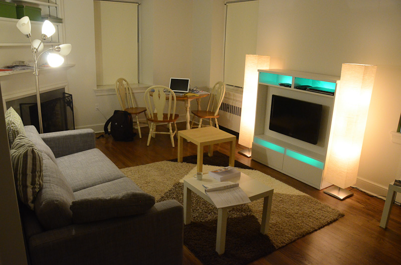Nou ja, het meeste komt dus van Ikea. En voor die eethoek ben ik helemaal (*) naar Pennsylvania gereden! De Amerikanen houden nog van heel donkere, zware meubels. En omdat er al niet veel licht mijn woonkamer binnenkomt, was dat geen optie.